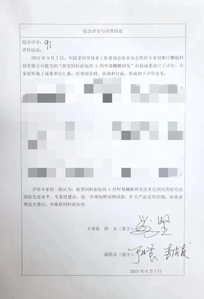El 7 de septiembre de 2024, los logros científicos y tecnológicos de "Investigación y desarrollo de 5-hidroximetilfurfural, un nuevo aditivo alimentario" presentados por Zhejiang Sugar Energy Technology Co., Ltd. pasaron la evaluación de expertos organizada por la Rama Agrícola de la Asociación China. de Científicos y Técnicos Superiores.